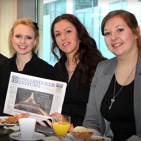 Lese- und Medienkompetenz junger Menschen fördern – dieses Ziel hat sich die Initiative ZUKUNFT BILDEN gesetzt. Das Bildungsprojekt der Regionen Osnabrück und Emsland wird von der Neuen Osnabrücker Zeitung (NOZ) koordiniert und richtet sich an Auszubildende regionaler Unternehmen. Die Sparkasse Osnabrück beteiligt sich bereits seit 2011 mit ihren Auszubildenden am Projekt. Diese erhalten ein Jahr lang ein kostenloses NOZ-Abonnement. Durch die regelmäßige Zeitungslektüre erhöhen sich sowohl die Lesekompetenz als auch die Allgemeinbildung der zukünftigen Fachkräfte. Ein wöchentliches Zeitungsquiz und vielfältige Mitmachaktionen, wie der Besuch des NOZ Druckzentrums, machen das Projekt für die jungen Zeitungsleser zusätzlich attraktiv. Ein besonderer Höhepunkt ist für die Auszubildenden der Sparkasse Osnabrück das jährliche Zeitungsfrühstück, das einen direkten und spannenden Austausch mit den Redakteuren der NOZ ermöglicht.